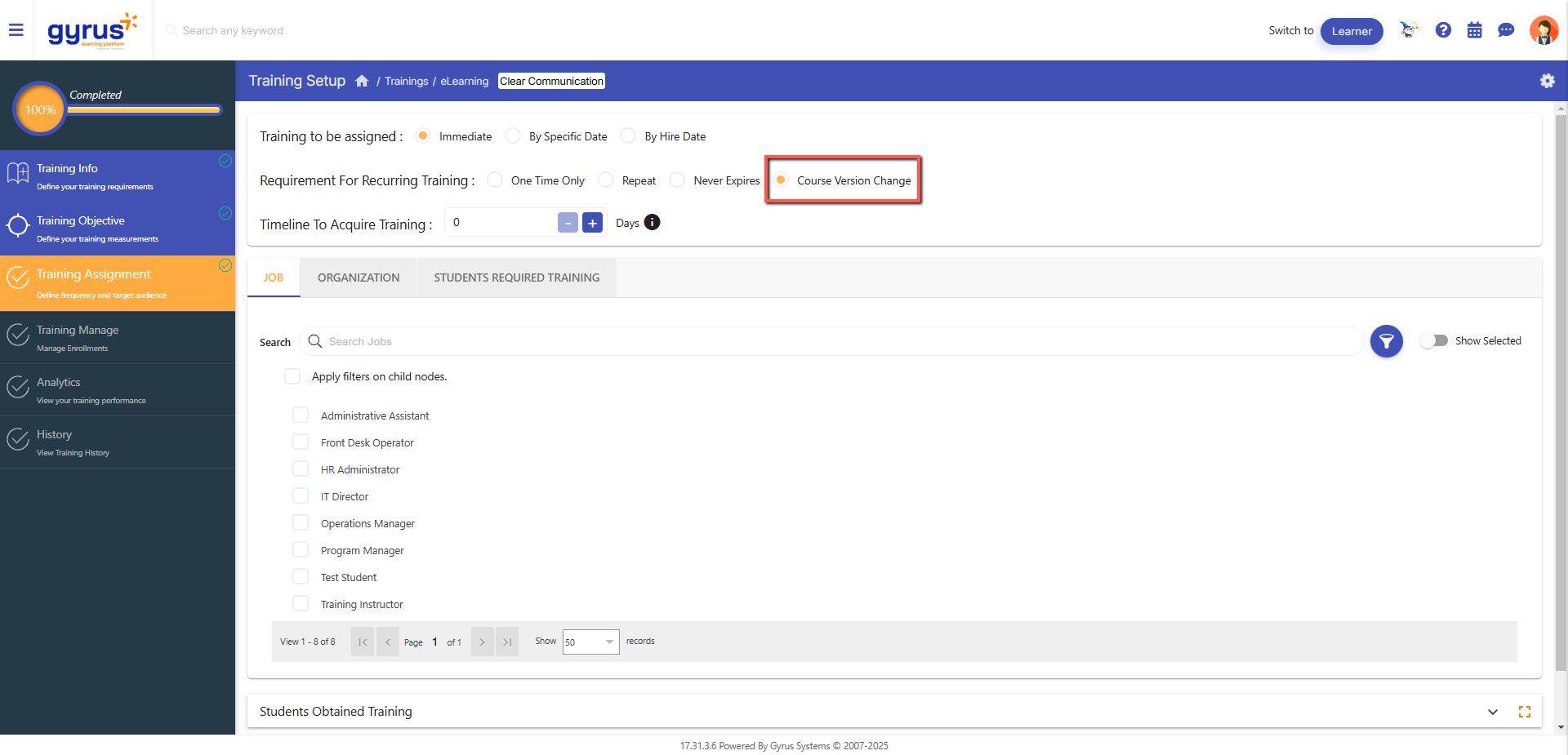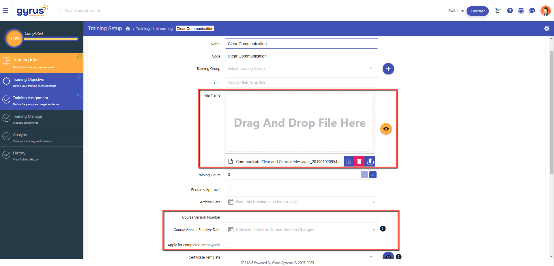 Apply for Completed Employees: Select this checkbox to require learners who completed the previous version to complete the new version after the Course Version Effective Date.