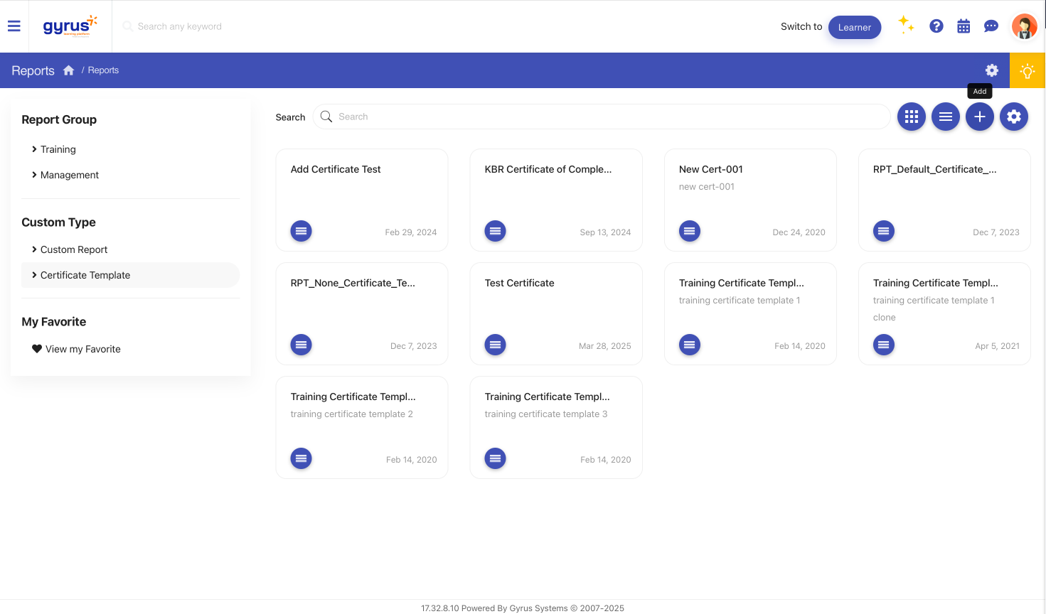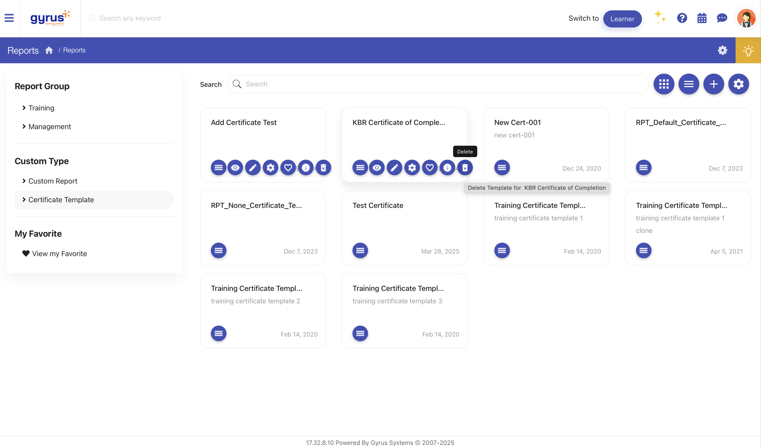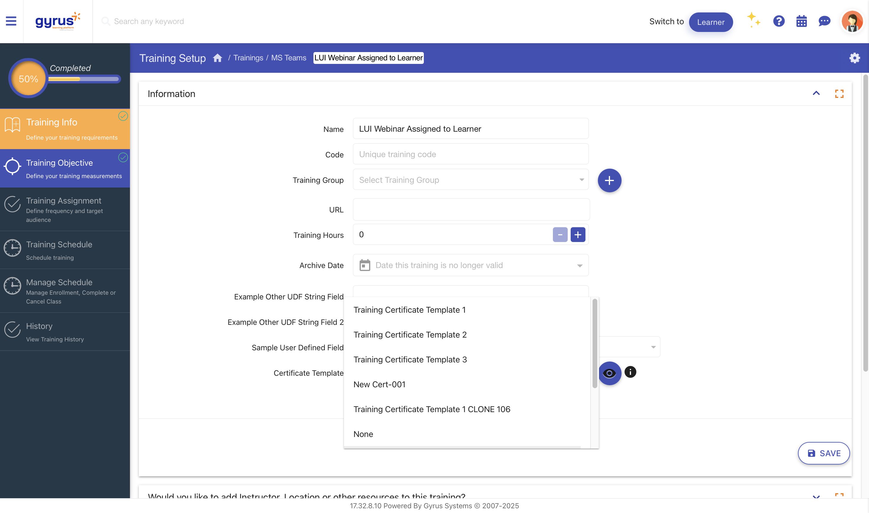 Gyrus v17.x allows administrators to create custom course completion certificates and apply them to trainings via the “Select Certificate” drop-down in the training setup.