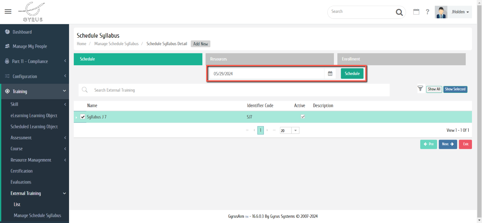 To schedule a syllabus, navigate to the External Training List. Right-click on the syllabus you wish to schedule and select the Schedule action button.