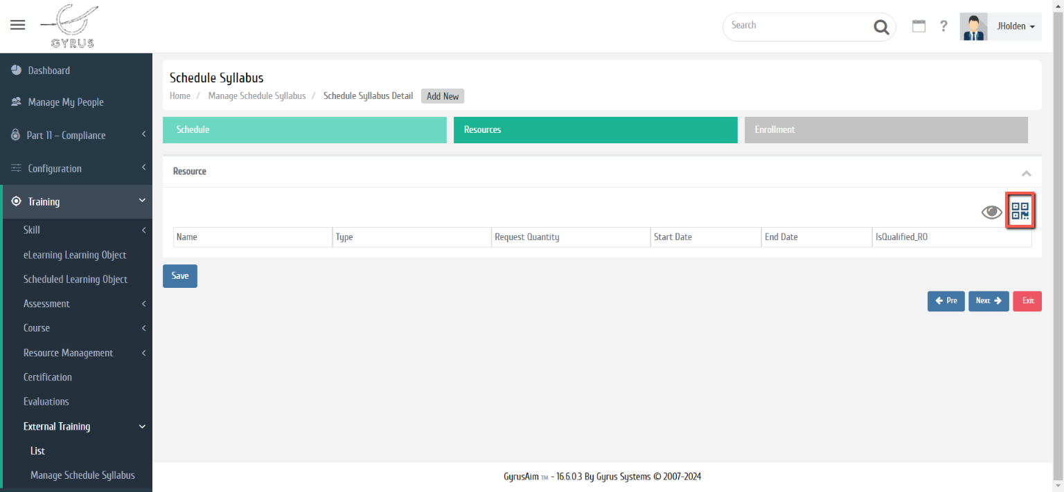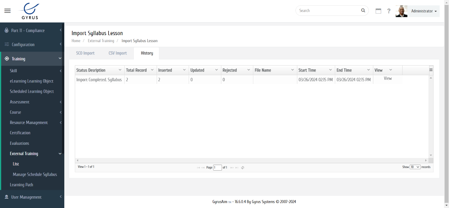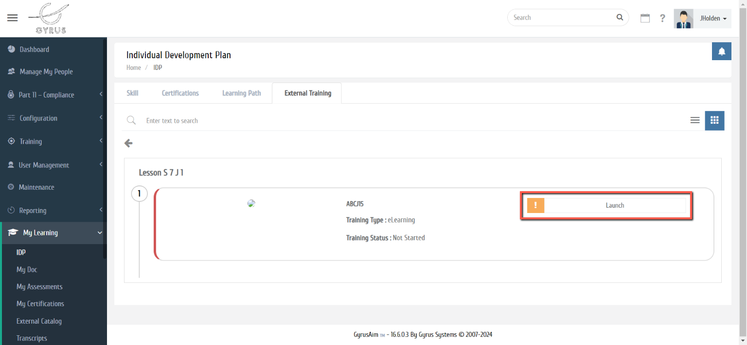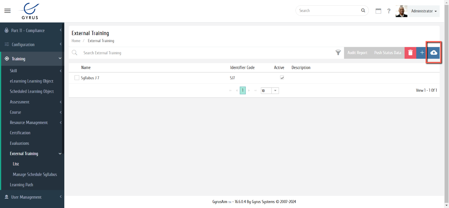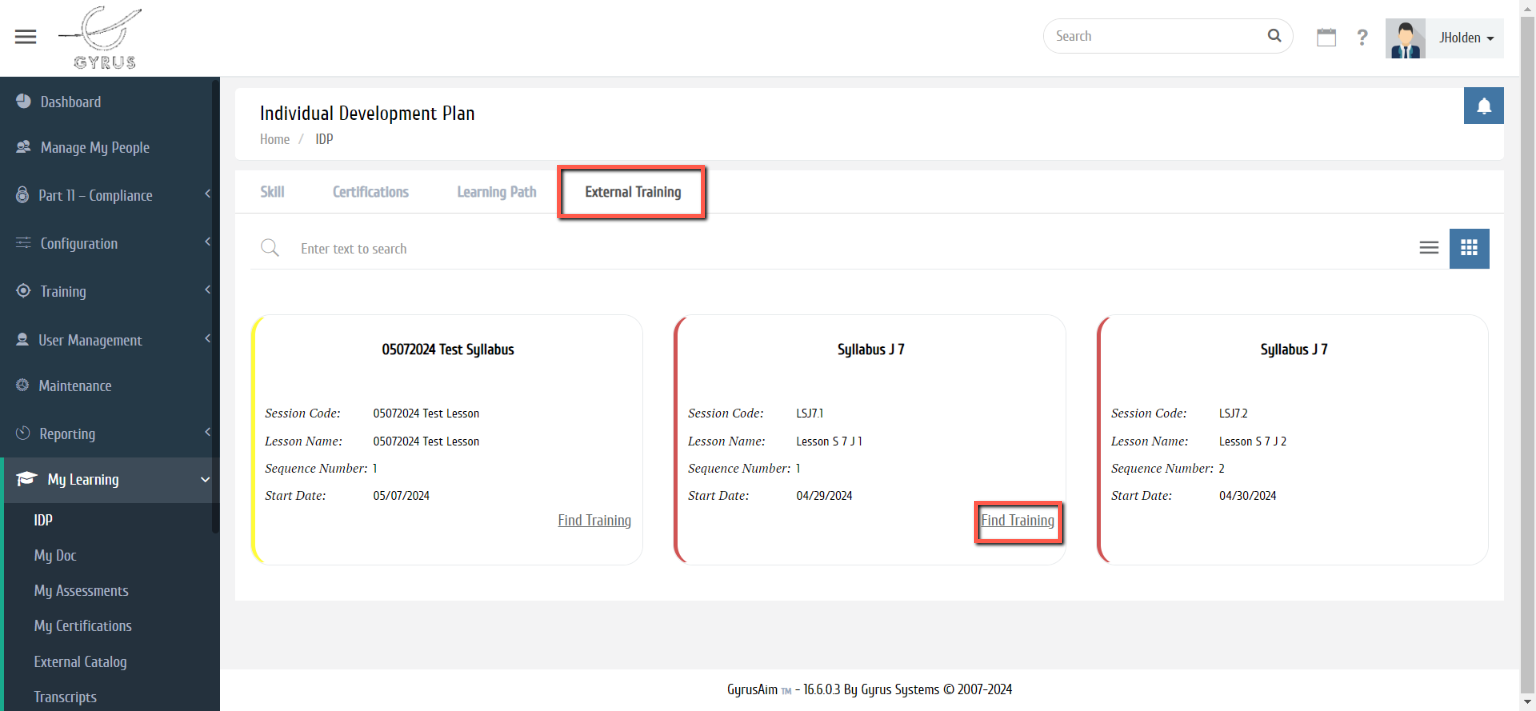 External Training may be accessed through the Navigation Menu > Training > External Training > List. From here you can see your Syllabus List.