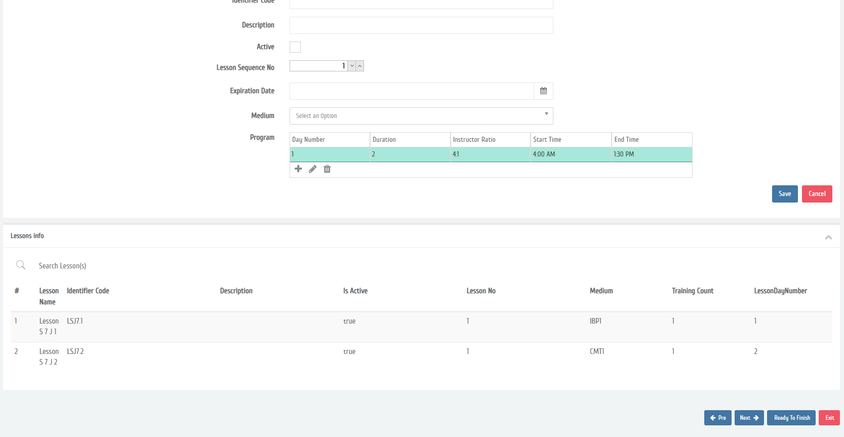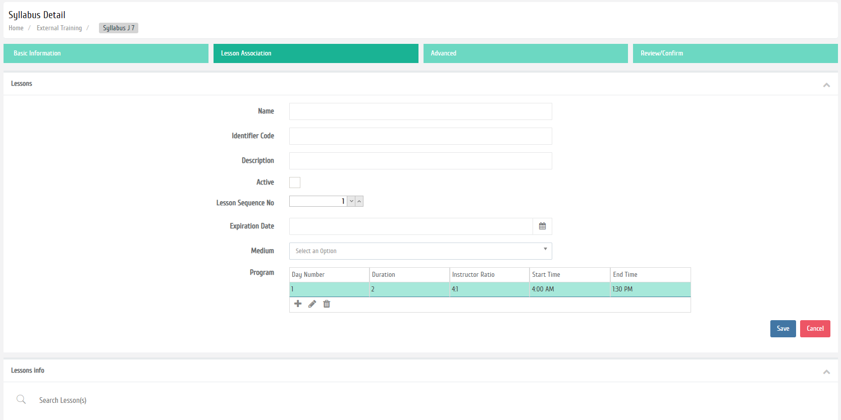 Once you have populated the fields, click Save. The saved lesson will appear within Lessons Info, in the bottom half of the page.