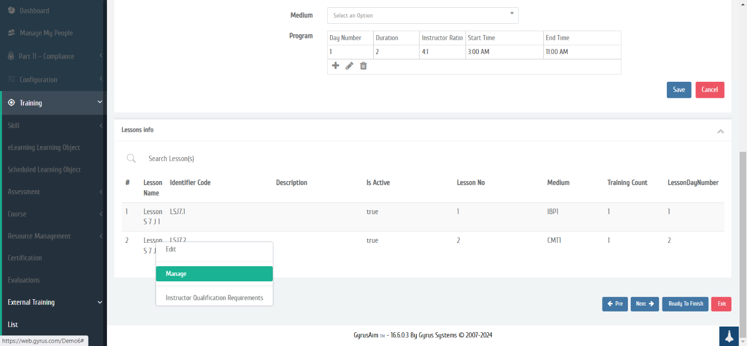 After the syllabus and lessons are created you can associate the LO into the lesson. Within the Syllabus > Lesson Association right-click the lesson and select the Manage action button.