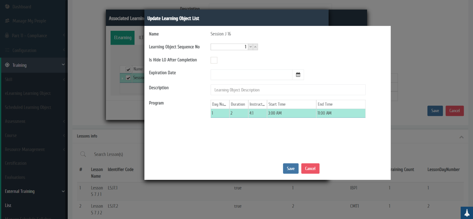 Select your LO and then populate the fields within the Update Learning Object List popup. You will need to set “Learning Object Sequence No” at the time of association. If the “Learning Object Sequence No ” is not set then the last sequence number is automatically applied. From the lesson update panel, a user can add a lesson level LO Expiration Date. This is not related to the LO master expiration date. The user can set different LO Expiration Date per lesson for a single LO that is associated with different lessons. Click Save once completed.