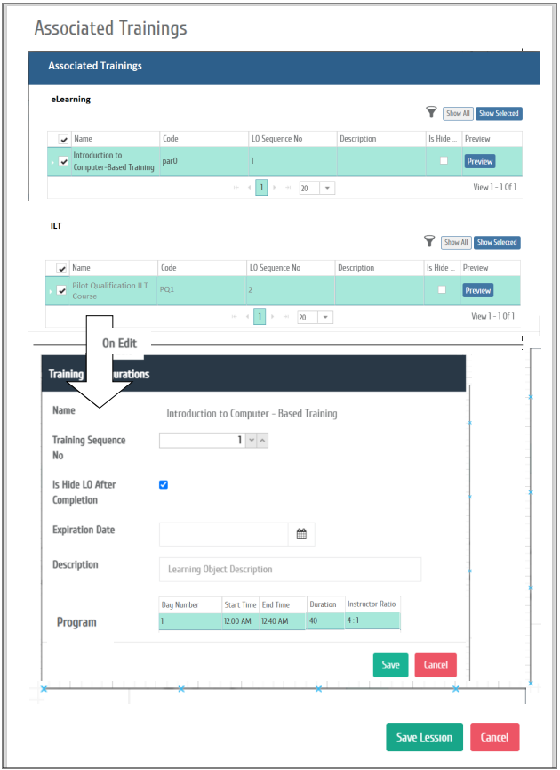 a) As shown in above Image 4, eLearning And Course (ILT) are available to select on the Manage Lesson page. A user can select a Learning Object with the Course as well.