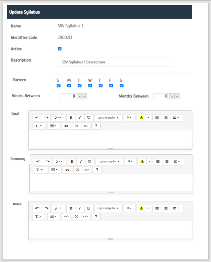 a. Text fields available to add information about the Syllabus. These fields can be viewed in different places in the application.