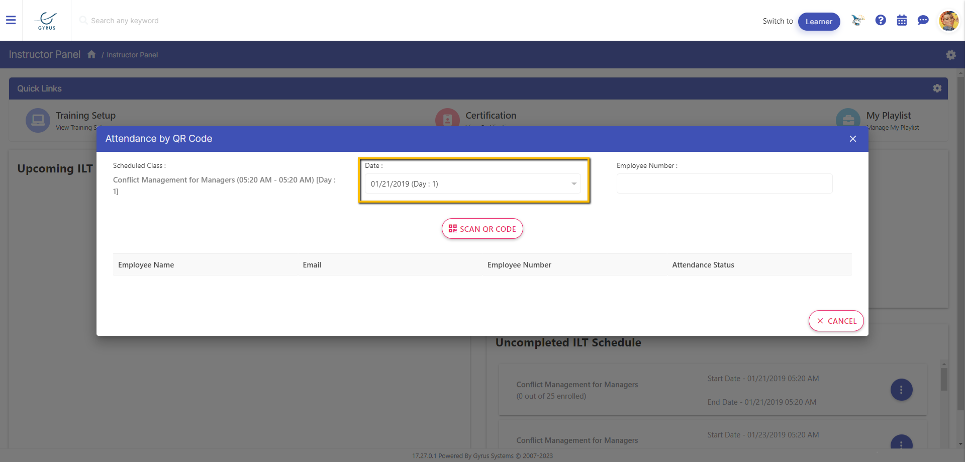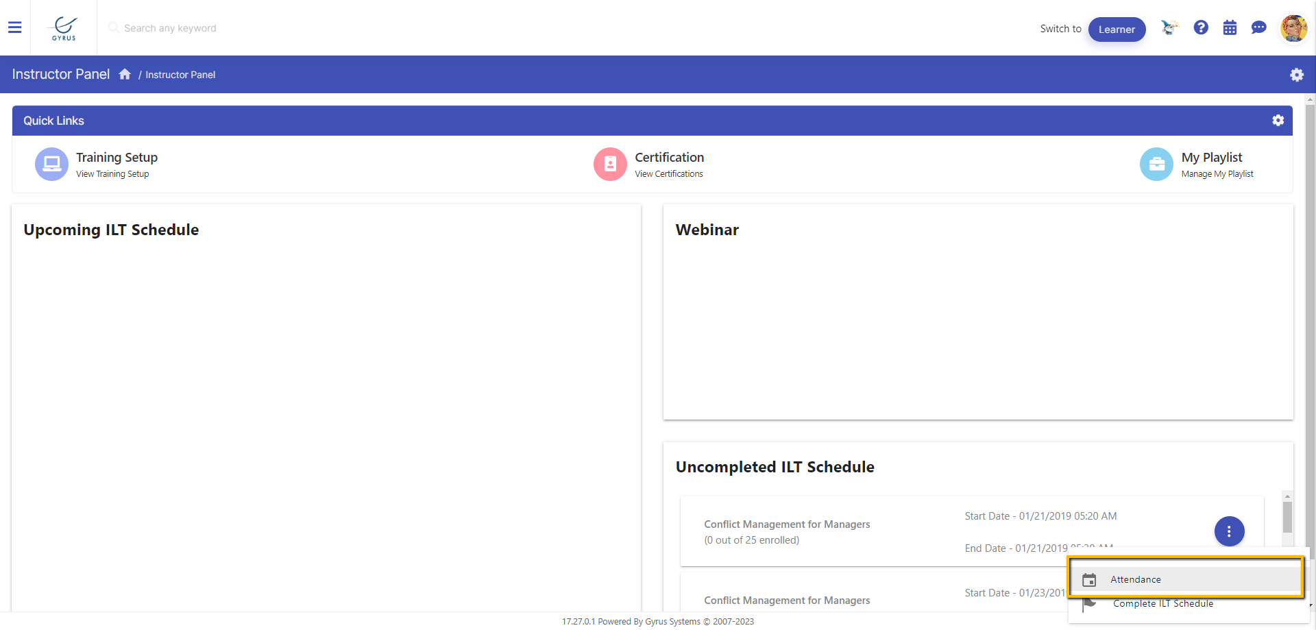 Screenshot of Instructor Panel highlighting Attendance for Uncompleted ILT Schedule