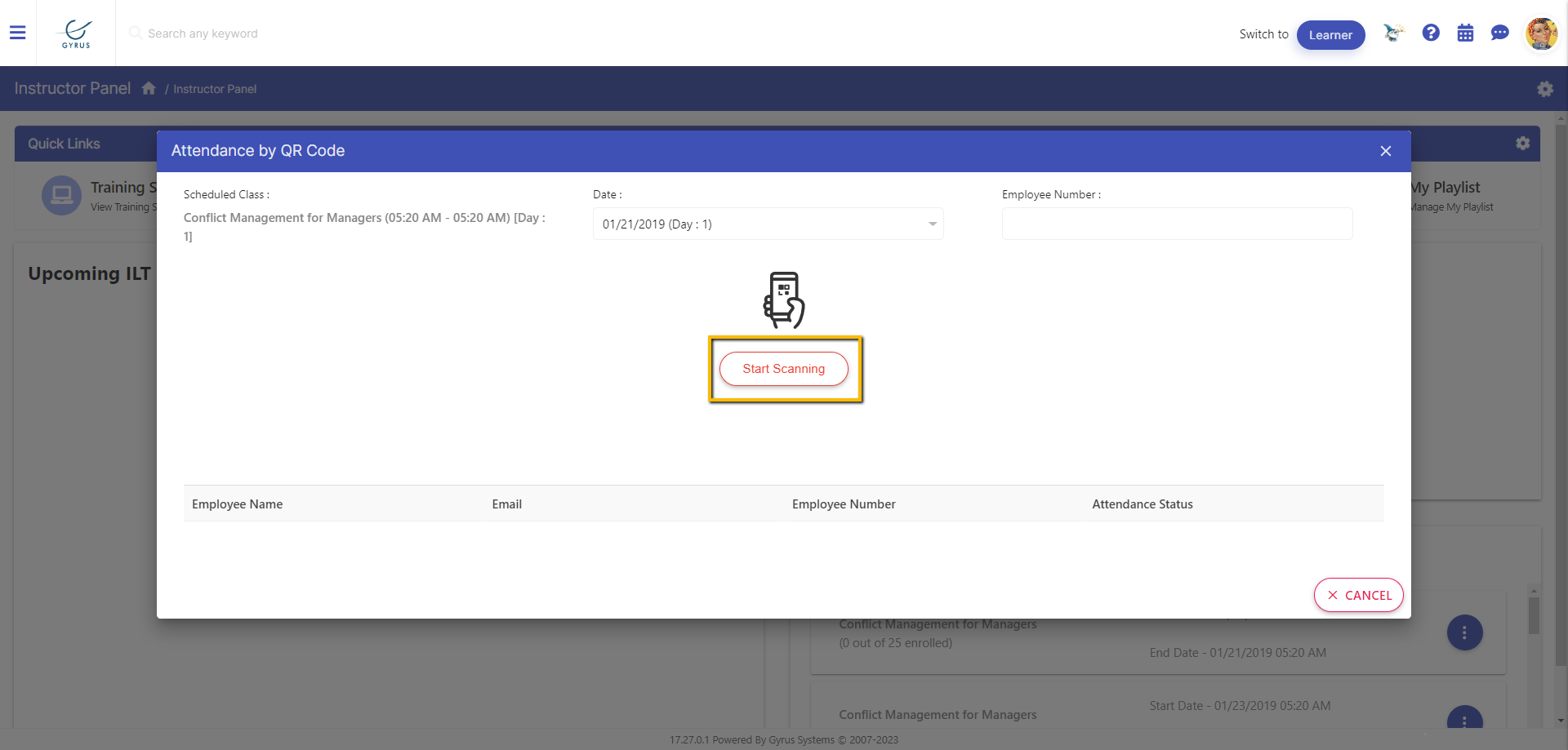 Screenshot of Attendance by QR Code with Date highlightedClick the Start Scanning action button.