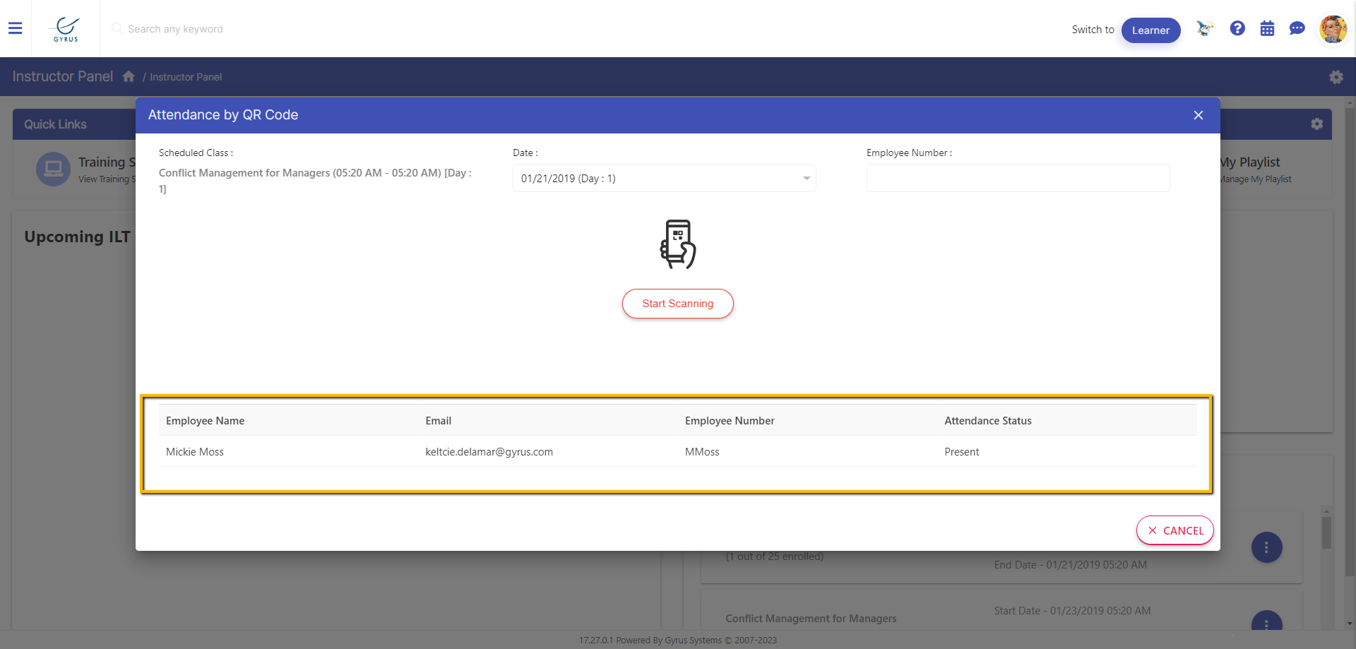 GyrusAim now provides functionality for Instructors to track class attendance using user-specific QR Codes in addition to the traditional manual sign-in sheet method. QR Codes can be scanned using either a scanner or any mobile device within the Instructor Panel.