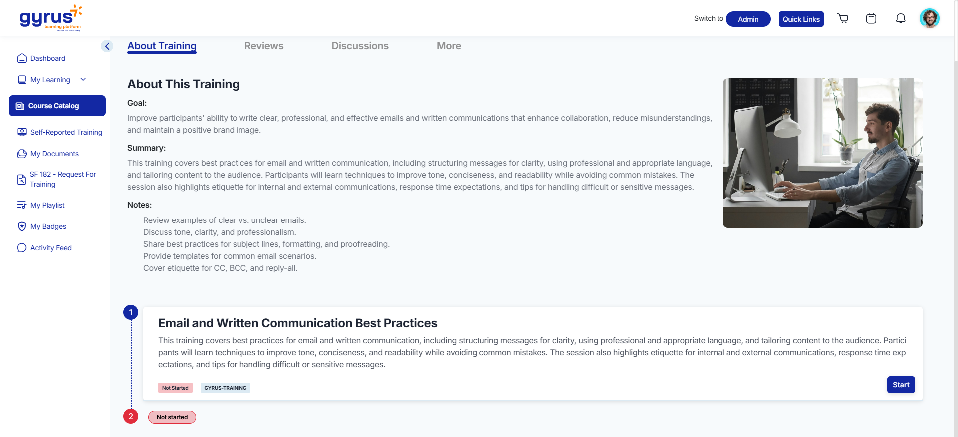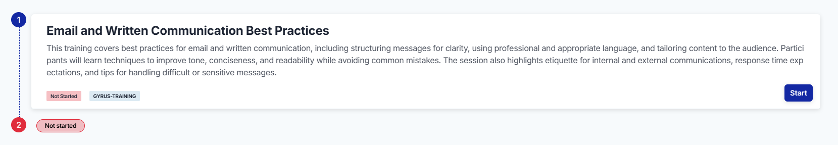 - The Training Detail Page lists all required steps for course completion.