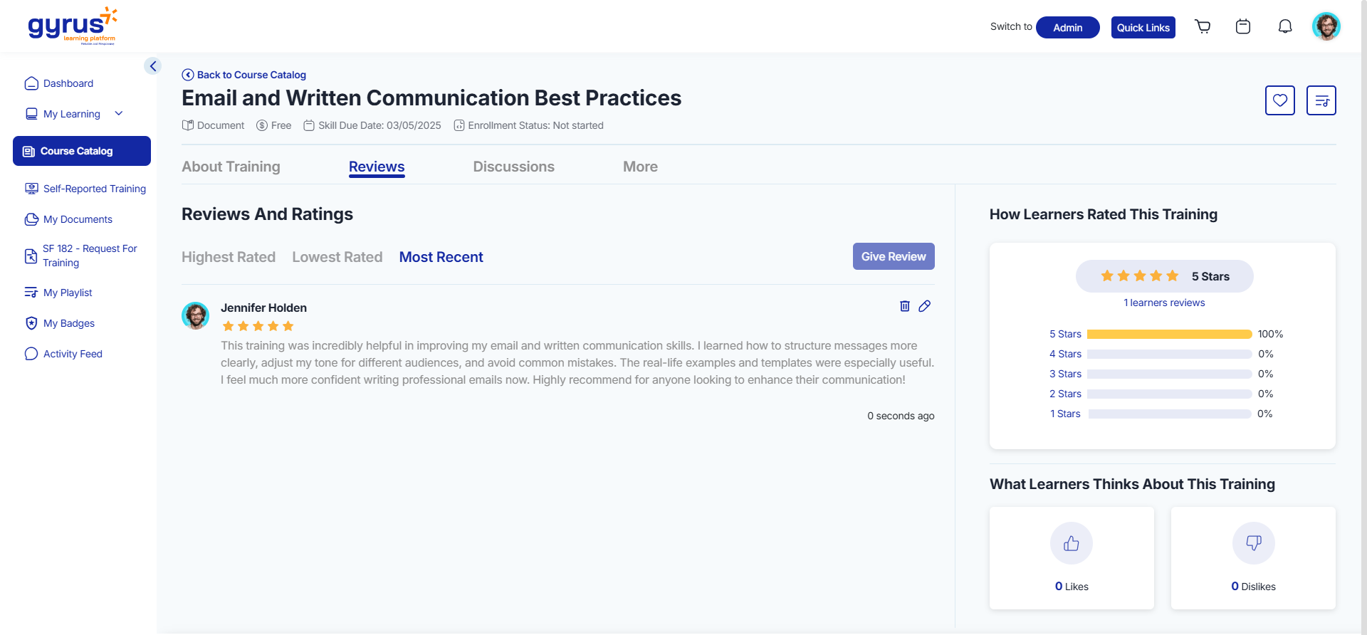 - Learners can view likes, dislikes, ratings, and written reviews from other users.
